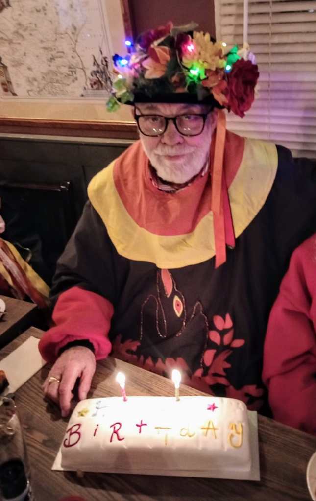 Later we went inside the pub, where we were very kindly given plates of sausages & chips by the establishment. We also sang “Happy Birthday” to Mike, our Squire, as he was presented with a cake.