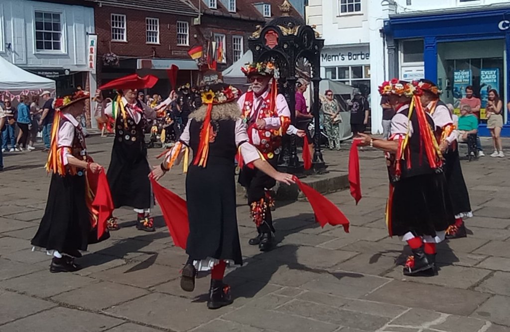 From the park and ride via a vintage bus, we started off in the historic Market Place. Here, Phoenix’s Squire, Mike Stimpson was presented with an award from the Open Morris for “Lifetime Services” within the JMO particularly with insurance & generally supporting the OM over many years. Congratulations Mike!
